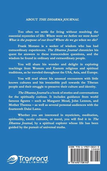 ABOUT THE DHARMA JOURNAL Too often we settle for living without resolving the essential mysteries of life: Where were we before we were born? What is the purpose of our lives? Where do we go when we die? Frank Morano is a seeker of wisdom who has had extraordinary experiences. The Dharma Journal chronicles his quest for answers to these transcendent questions, and the wisdom he found in ordinary and extraordinary people. You will share his wonder and delight in exploring teachings from Western and Eastern religious and spiritual traditions, as he traveled throughout the USA, Asia, and Europe. You will read about his unusual encounters with little known cultures and his irresistible pull towards the Tibetan people and their struggle to preserve their culture and identity. The Dharma Journal is a book of stories and conversations for the spiritually curious. It includes guidance from world famous figures, such as Margaret Mead, John Lennon and Mother Theresa, as well as several personal audiences with the fourteenth Dalai Lama. Whether you are interested in mysticism, meditation, spirituality, exotic cultures, or travel, you will find it in The Dharma Journal, by a spiritual explorer whose life has been guided by the pursuit of universal truths.