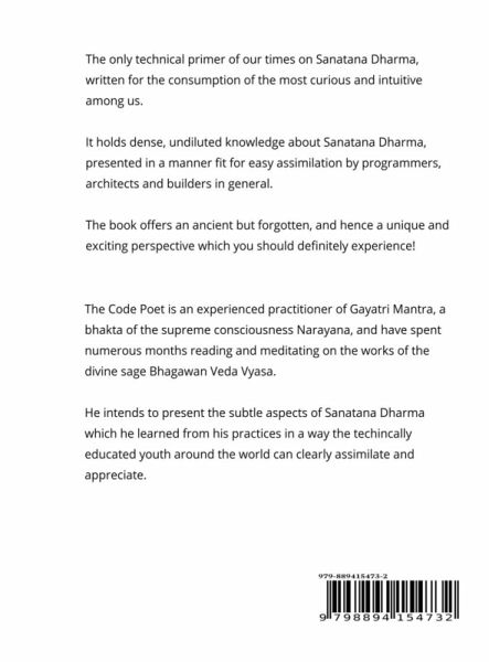 The Dharma Manual is the only technical primer of our times on Sanatana Dharma, written for the consumption of the most curious and intuitive among us. It holds dense, undiluted knowledge about Sanatana Dharma, written in a manner fit for easy assimilation by programmers, architects and builders in general. The book offers a unique perspective you should definitely experience!