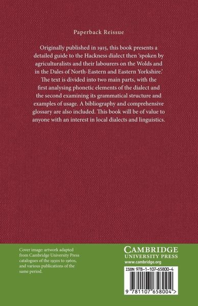 Originally published in 1915, this book presents a detailed guide to the Hackness dialect then 'spoken by agriculturalists and their labourers on the Wolds and in the Dales of North-Eastern and Eastern Yorkshire'. The text is divided into two main parts, with the first analysing phonetic elements of the dialect and the second examining its grammatical structure and examples of usage. A bibliography and comprehensive glossary are also included. This book will be of value to anyone with an interest in local dialects and linguistics.
