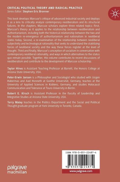 Introduction.- Part I: Neoliberal Authoritarianism.- Chapter 1: Terry Maley, Building on Marcuse: An Assessment of the New Phase of Neoliberal Despotism.- Chapter 2: Samir Gandesha, The "Authoritarian Personality" Reconsidered: The Phantom of "Left Fascism".- Chapter 3: Luca Mandara, Marcuse and the Social Networkers.- Chapter 4: Rodney Doody, The Hedonism and Asceticism of Neoliberal Subjectivity: The Crude Needs of Consumer Capitalism and its Social, Psychological, and Ecological Devastation.- Chapter 5: Christian Garland, Turning Sense Into Nonsense and Nonsense Into Sense: Critical Theory to Refuse the Fallacy of Populism.- Chapter 6: Lauren Langman, Refusals Redux.- Part II: Neoliberalism and Technological Rationality.- Chapter 7: Stefan Gandler, Multiple Subjectivities in Neoliberal Times: Reflections from a Critical Theory in Latin America.- Chapter 8: Haggag Ali, Receptions of Herbert Marcuse's Critical Theory: A ComparativeApproach to Telos and Al Fekr Al Mo'aser.- Chapter 9: Wes Furlotte, A Dialectical Critique of Pure Recognition: Settler-Colonialism within Advanced Industrial Canada.- Chapter 10: Nicole K. Mayberry, Color-Blind Racism and One-Dimensionality: Imagining Marcusean Conditions of Freedom Through the Black Radical Tradition.- Chapter 11: Taylor Hines, Artificial Reverie and Administered Negativity.- Chapter 12: Robert E. Kirsch, Reigniting Racket Theory: Horkheimer's Unfinished Project and Marcuse's Affinity for American Institutionalism.- Part III: Socialism(s): Still the Proper Response.- Chapter 13: Peter-Erwin Jansen, Human Rights: A Concrete Utopian Concept.- Chapter 14: Charles Reitz, Revolutionary Ecological Liberation: EarthCommonWealth.- Chapter 15: Imaculada Kangussu, 2020: Nature Said, "Stop".- Chapter 16: Casey Robertson, Marcusean Pathways for Queer Agency through Sonic Conceptions of Noise in the Twenty-First Century.- Chapter 17: James William Lincoln, The Unfreedom of Moral Perception during Occurrent Experience.- Chapter 18: Peter Marcuse, From Reform Politics towards Liberation during the Suicide of Capitalism: Examples from Housing Policy.- Afterword, Douglas Kellner.