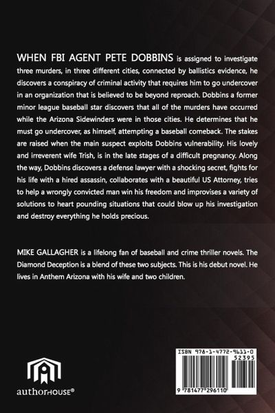 When FBI Agent Pete Dobbins is assigned to investigate three murders, in three different cities, connected by ballistics evidence, he discovers a conspiracy of criminal activity that requires him to go undercover in an organization that is believed to be beyond reproach. Dobbins a former minor league baseball star discovers that all of the murders have occurred while the Arizona Sidewinders were in those cities. He determines that he must go undercover, as himself, attempting a baseball comeback. The stakes are raised when the main suspect exploits Dobbins vulnerability. His lovely and irreverent wife Trish, is in the late stages of a difficult pregnancy. Along the way, Dobbins discovers a defense lawyer with a shocking secret, fights for his life with a hired assassin, collaborates with a beautiful US Attorney, tries to help a wrongly convicted man win his freedom and improvises a variety of solutions to heart pounding situations that could blow up his investigation and destroy everything he holds precious.