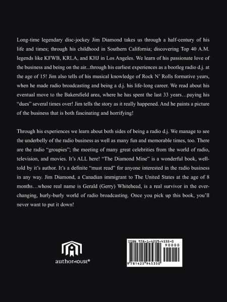 Long-time legendary disc-jockey Jim Diamond takes us through a half-century of his life and times; through his childhood in Southern California; discovering Top 40 A.M. legends like KFWB, KRLA, and KHJ in Los Angeles. We learn of his passionate love of the business and being on the air...through his earliest experiences as a bootleg radio d.j. at the age of 15! Jim also tells of his musical knowledge of Rock N' Rolls formative years, when he made radio broadcasting and being a d.j. his life-long career. We read about his eventual move to the Bakersfield area, where he has spent the last 33 years.paying his "dues" several times over! Jim tells the story as it really happened. And he paints a picture of the business that is both fascinating and horrifying! Through his experiences we learn about both sides of being a radio d.j. We manage to see the underbelly of the radio business as well as many fun and memorable times, too. There are the radio "groupies"; the meeting of many great celebrities from the world of radio, television, and movies. It's ALL here! "The Diamond Mine" is a wonderful book, well-told by it's author. It's a definite "must read" for anyone interested in the radio business in any way. Jim Diamond, a Canadian immigrant to The United States at the age of 8 months.whose real name is Gerald (Gerry) Whitehead, is a real survivor in the ever-changing, hurly-burly world of radio broadcasting. Once you pick up this book, you'll never want to put it down!