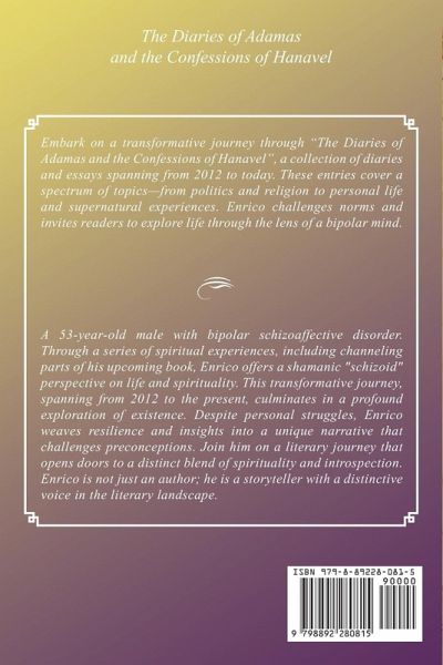 Embark on a transformative journey through " The Diaries of Adamas and the Confessions of Hanavel", a collection of diaries and essays spanning from 2012 to today. These entries cover a spectrum of topics-from politics and religion to personal life and supernatural experiences. Enrico challenges norms and invites readers to explore life through the lens of a bipolar mind.