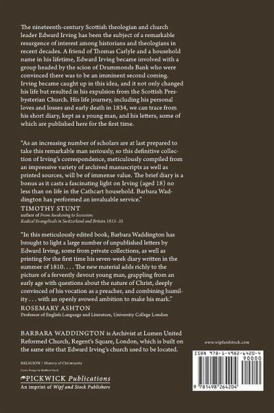 Description: The nineteenth-century Scottish theologian and church leader Edward Irving has been the subject of a remarkable resurgence of interest among historians and theologians in recent decades. A friend of Thomas Carlyle and a household name in his lifetime, Edward Irving became involved with a group headed by the scion of Drummonds Bank who were convinced there was to be an imminent second coming. Irving became caught up in this idea, and it not only changed his life but resulted in his expulsion from the Scottish Presbysterian Church. His life journey, including his personal loves and losses and early death in 1834, we can trace from his short diary, kept as a young man, and his letters, published here for the first time. Endorsements: ""As an increasing number of scholars are at last prepared to take this remarkable man seriously, so this definitive collection of Irving's correspondence, meticulously compiled from an impressive variety of archived manuscripts as well as printed sources, will be of immense value. The brief diary is a bonus as it casts a fascinating light on Irving (aged eighteen) no less than on life in the Cathcart household. Barbara Waddington has performed an invaluable service."" --Timothy Stunt, author of From Awakening to Secession: Radical Evangelicals in Switzerland and Britain 1815-35 ""In this meticulously edited book, Barbara Waddington has brought to light a large number of unpublished letters by Edward Irving, some from private collections, as well as printing for the first time his seven-week diary written in the summer of 1810. . . . The new material adds richly to the picture of a fervently devout young man, grappling from an early age with questions about the nature of Christ, deeply convinced of his vocation as a preacher, and combining humility . . . with an openly avowed ambition to make his mark."" --Rosemary Ashton, Professor of English Language and Literature, University College London About the Contributor(s): Barbara Waddington is Archivist at Lumen United Reformed Church, Regent's Square, London; the building in which Edward Irving's church used to meet.