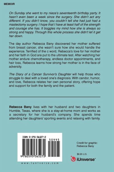 On Sunday she went to my niece's seventeenth birthday party. It hasn't even been a week since the surgery. She didn't act any different. If you didn't know, you couldn't tell she had just had a mastectomy surgery. I hope that I have at least half of the strength and courage she has. It boggles my mind how she is always so strong and happy. Through this whole process she didn't let it get her down. The day author Rebecca Bany discovered her mother suffered from breast cancer, she wasn't sure how she would handle the experience. Terrified of the c word, Rebecca's love for her mother and her faith in God are put to the ultimate test. After watching her mother endure chemotherapy, endless doctor appointments, and hair loss, Rebecca learns how strong her mother is in the face of adversity. The Diary of a Cancer Survivor's Daughter will help those who struggle to deal with a loved one's diagnosis. With candor, humor, and love, Rebecca relates her own personal story, offering hope and support for both the family and the patient.