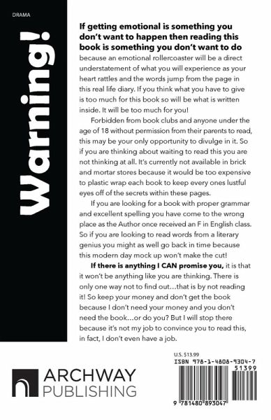 If getting emotional is something you don't want to happen then reading this book is something you don't want to do because an emotional rollercoaster will be a direct understatement of what you will experience as your heart rattles and the words jump from the page in this real life diary. If you think what you have to give is too much for this book so will be what is written inside. It will be too much for you! Forbidden from book clubs and anyone under the age of 18 without permission from their parents to read, this may be your only opportunity to divulge in it. So if you are thinking about waiting to read this you are not thinking at all. It's currently not available in brick and mortar stores because it would be too expensive to plastic wrap each book to keep every ones lustful eyes off of the secrets within these pages. If you are looking for a book with proper grammar and excellent spelling you have come to the wrong place as the Author once received an F in English class. So if you are looking to read words from a literary genius you might as well go back in time because this modern day mock up won't make the cut! If there is anything I CAN promise you, it is that it won't be anything like you are thinking. There is only one way not to find out...that is by not reading it! So keep your money and don't get the book because I don't need your money and you don't need the book...or do you? But I will stop there because it's not my job to convince you to read this, in fact, I don't even have a job.