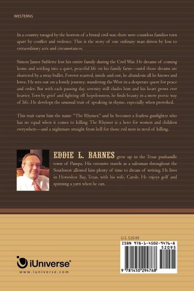 In a country ravaged by the horrors of a brutal civil war, there were countless families torn apart by conflict and violence. This is the story of one ordinary man driven by loss to extraordinary acts and circumstances. Simon James Sublette lost his entire family during the Civil War. He dreams of coming home and settling into a quiet, peaceful life on his family farm-until those dreams are shattered by a stray bullet. Forever scarred, inside and out, he abandons all he knows and loves. He sets out on a lonely journey, wandering the West in a desperate quest for peace and order. But with each passing day, serenity still eludes him and his heart grows ever heavier. Torn by grief and fighting off hopelessness, he finds beauty in a more poetic way of life. He develops the unusual trait of speaking in rhyme, especially when provoked. This trait earns him the name "The Rhymer," and he becomes a fearless gunfighter who has no equal when it comes to killing. The Rhymer is a hero for women and children everywhere-and a nightmare straight from hell for those evil men in need of killing.