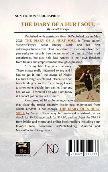 Published with assistance from BePublished.org in May 2021, THE DIARY OF A HURT SOUL is Texas author Venetric'Faye's debut literary work and her first autobiographical novel. This collection of memories from her past seeks to not only free the author of the trauma of the lived experiences, but also help lead readers to their own freedom from trauma and empowerment through expression. "It's my life. This is a true story. These things really happened to me and I had to get it out," the owner of Nadori Couture Designs explained. "Because I had been holding on to this for so long, I want to show other people they can let it go and heal as well. I wouldn't be who I am today if I hadn't gotten this out of me." Comprised of 10 soul-stirring chapters that place the reader squarely inside past experiences from which survival is not enough, THE DIARY OF A HURT SOUL by Venetric'Faye may be purchased worldwide as an ebook for $9.95, paperback for $19.95, and hardback for $34.95 from bricks-and-mortar and online book retailers including your local bookstore, BePublished.org, Amazon and NadoriCoutureDesigns.com.