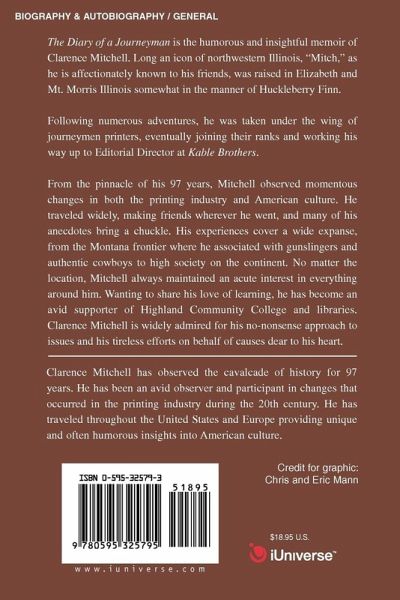 The Diary of a Journeyman is the humorous and insightful memoir of Clarence Mitchell. Long an icon of northwestern Illinois, "Mitch," as he is affectionately known to his friends, was raised in Elizabeth and Mt. Morris Illinois somewhat in the manner of Huckleberry Finn. Following numerous adventures, he was taken under the wing of journeymen printers, eventually joining their ranks and working his way up to Editorial Director at Kable Brothers. From the pinnacle of his 97 years, Mitchell observed momentous changes in both the printing industry and American culture. He traveled widely, making friends wherever he went, and many of his anecdotes bring a chuckle. His experiences cover a wide expanse, from the Montana frontier where he associated with gunslingers and authentic cowboys to high society on the continent. No matter the location, Mitchell always maintained an acute interest in everything around him. Wanting to share his love of learning, he has become an avid supporter of Highland Community College and libraries. Clarence Mitchell is widely admired for his no-nonsense approach to issues and his tireless efforts on behalf of causes dear to his heart.