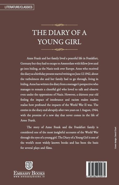 Anne Frank and her family lived a peaceful life in Frankfurt, Germany but they had to escape to Amsterdam with fellow Jews and go into hiding, as the Nazis took over Europe. Anne who received the Diary as a birthday present started writing on June 12 1942, about the turbulence she and her family had to go through, living in hiding. Anne has written the Diary from a teenager's perspective who manages to remain a cheerful girl who loved to talk and observe even under the oppressions of Nazis. However, a thirteen year old feeling the impact of intolerance and racism makes readers realise how profound the impacts of the world War II was. The entries in the Diary end abruptly after two years on 1 August, 1944, with the promise of a new day that never comes in the life of Anne Frank. The story of Anne Frank and the Frankfurt family is considered one of the most insightful accounts of the world War through the eyes of a young girl. The Diary of a young girl is one of the world's most widely known books and has been the basis for several plays and films.