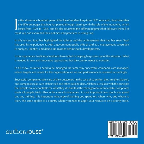 In the almost one hundred years of the life of modern Iraq (from 1921 onwards), Saad describes the different stages that Iraq has passed through, starting with the rule of the monarchy, which lasted from 1921 to 1958, and he also reviewed the different regimes that followed the fall of royal Iraq and examined their policies and practices in ruling Iraq. In this review, Saad has highlighted the failures and the achievements that Iraq has seen. Saad has used his experience as both a government public official and as a management consultant to analyze, identify, and define the reasons behind such developments. In his experience, traditional methods have failed in helping Iraq come out of this situation. What is needed is new and innovative approaches that the country needs to consider. In his view, countries need to be managed the same way successful companies are managed, where targets and values for the organization are set and performance is assessed accordingly. Successful companies take care of their customers (in the case of countries, they are the citizens), and companies take care of their staff and other stakeholders. All these are taken with the principle that people are accountable for what they do and that the management of successful companies treats all people fairly. Also in the case of companies, it is not important how much you spend on, say, training. It is important what type of training you spend on, when, why, and whom to train. The same applies to a country where you need to apply your resources on a priority basis.