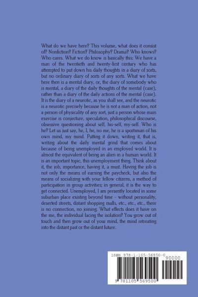 What do we have? Nonfiction? Fiction? Philosophy? Who cares! We do have a man of the 20th and 21st centuries attempting to jot down his daily thoughts. We have a mental diary, or, the diary of somebody who is mental; here, here thoughts of the mental (case), rather than thoughts of the actions of the mental (case). It's a diary of a neurotic, and the neurotic is one precisely because he's not a man of action, not a person of physicality, just one whose main exercise is conjecture, speculation, and obsessive questioning. He, I, is a sportsman of his own mind. Writing about the mental grind of being unemployed in an employed world. The job, having it, a must. The means of earning the paycheck; the means of socialization in group rituals. Unemployed and presently stuck in the suburbs existing beyond time - deserted streets, distant shopping malls, emptied homes. The individual isolated and growing out of touch and out of his mind; the mind retreating into the distant past and future.