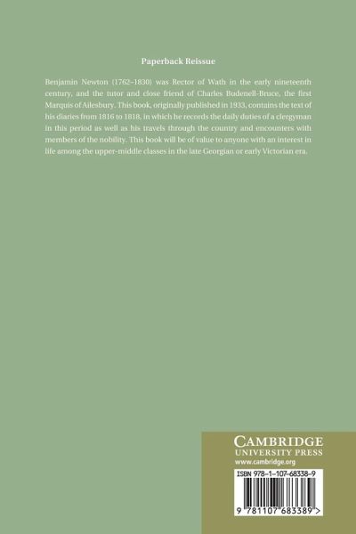 Benjamin Newton (1762-1830) was Rector of Wath in the early nineteenth century, and the tutor and close friend of Charles Budenell-Bruce, the first Marquis of Ailesbury. This book, originally published in 1933, contains the text of his diaries from 1816 to 1818, in which he records the daily duties of a clergyman in this period as well as his travels through the country and encounters with members of the nobility. This book will be of value to anyone with an interest in life among the upper-middle classes in the late Georgian or early Victorian era.