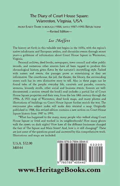The history set forth in this valuable text begins in the 1600s, with the region's native inhabitants and European settlers, and chronicles events through recent years_a goldmine of information about Court House Square in Warrenton, Virginia. Personal archives, deed books, newspapers, town council and other public records, and numerous other sources have all been tapped to produce this chronological history, given flavor by the narrator's storytelling style. Packed with names and events, the passages prove as entertaining as they are informative. The courthouse, the jail, the theater, the library, the surrounding stores: each has its own distinctive story to tell. Also in these pages can be found tales of the people: everyday life, carnivals and parades, concerts, sermons, leisurely strolls, other social and business events. Sources are well-documented; a section toward the book's end includes a partial list of Court House Square properties and their uses, from the late 18th century through the 1990s. A 1921 map of Warrenton, deed book maps, and many photos and illustrations of buildings on Court House Square further enrich the text. The everyname plus subject index will make data retrieval a snap. Originally published in 1988, this revised edition contains a new section on Court House Square history from 1987 to 1995. "What has happened to the many, many people who walked along Court House Square or lived and worked in its neighborhoods? How many ghosts walk the streets on dark nights? How have all the different businesses changed the face of The Square and Main Street? And, how is it still changing?" These are just some of the questions posed and answered by this comprehensive work. Includes illustrations and maps.