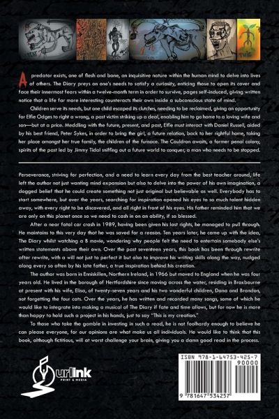 BOOK SUMMARY/SYNOPSIS: A predator exists, one of flesh and bone, an inquisitive nature within the human mind to delve into lives of others. The Diary preys on one's needs to satisfy a curiosity, enticing those to open its cover and face their innermost fears within a twelve-month term in order to survive, pages self-induced, giving written notice that a life far more interesting counteracts their own inside a subconscious state of mind. Children serve its needs, but one child escaped its clutches, needing to be reclaimed, giving an opportunity for Elfie Odges to right a wrong, a past victim striking up a deal, enabling him to go home to a loving wife and son-but at a price. Meddling with the future, present, and past, Elfie must interact with Daniel Russell, aided by his best friend, Peter Sykes, in order to bring the girl, a future relation, back to her rightful home, takingher place amongst her true family, the children of the furnace. The Cauldron awaits, a former penal colony, spirits of the past led by Jimmy Tidal sniffing out a future world to conquer, a man who needs to be stopped. ABOUT THE AUTHOR The author was born in Enniskillen, Northern Ireland, in 1966 but moved to England when he was four years old. He lived in the borough of Hertfordshire since moving across the water, residing in Broxbourne at present with his wife, Elisa, of twenty-seven years and his two wonderful children, Dana and Brandon, not forgetting the four cats. Over the years, he has written and recorded many songs, some of which he would like to integrate into making a musical of The Diary if fate and time allows, but for now he is more than happy to hold such a project in his hands, just to say "This is my creation." ??To those who take the gamble in investing in such a read, he is not foolhardy enough to believe he can please everyone, for our opinions are what make us all individuals. He would like to think that this book, although fictitious, will at worst challenge your brain, giving you a damn good read in the process.