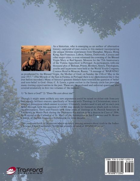 As a historian of a different making, Francisco seeks to capture the heart of his past and that of spirituality through lifetime memories from boyhood days in Shanghai and Macau to day dreams as a young man in Hong Kong, from new family life in San Francisco as a naturalized citizen to rebirth of mind through a number of pilgrimages to Fatima, Medjugorje and Moscow with his extended family. Together with his spiritual partner and second wife of 30 years Terry, he witnessed the crowning of the Blessed Virgin Mary at the Red Square in Moscow for the 75th Anniversary of the 'Fatima Apparition' in Portugal. As just two amongst one thousand plus of God's children from bishops to priests, theologians, brothers, sisters, youths and other laypersons that were there that day, they joined together at the 1992 World Youth Congress in Moscow to share a very special message with the world about the need for change. It was a message of 'WARNING' as prophesized by the Blessed Virgin, the Mother of God, on Sunday the 13th of May in the year 1917. But more importantly, it was also a call for love and spiritual renewal. There has been no phenomenon like it ever before recorded, but the miracle of the sun in Fatima continues to shine bright even at the darkest of times and is the hope behind this book. Many of history's greatest thinkers have wrestled with the question of belief and non-belief in God through their literary circles and often simply by the way they have lived their lives: 1) "Is there a God?" and 2) "Why would He care about me?" Those are profound and universal questions considered in the first two books of this family story and re-visited here in this third encounter in trilogy. Though it might seem unlikely that any new arguments can be raised from either side between Science and Theology on Christendom, ultimately, each reader needs to ask through his or her own voice of Faith this question of GOD and His existence. It is at that spiritual juncture of question and answer that mankind may decide which path to follow. As seminarian students, Terry and Francis took three years of theology at St. Patrick Seminary & University in Menlo Park under the Diaconate Formation Program with the hopes of Francisco becoming a deacon with the Class of 2006. Though God had other plans for Francisco, both husband and wife humbly served at the Cathedral of St. Mary of the Assumption in San Francisco and at St. Bruno Church of the San Francisco Archdiocese for three decades. This soulful dialogue is for anyone seeking out answers about Judeo-Christian ethics and the belief that GOD reveals all in time.
