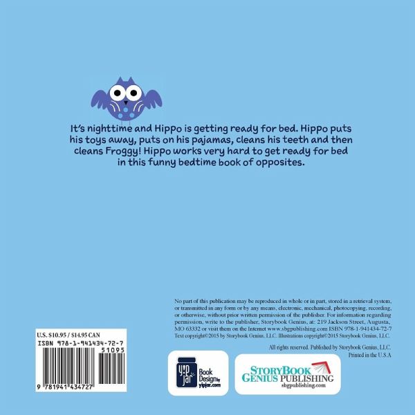 It's nighttime and Hippo is getting ready for bed. Hippo puts his toys away, puts on his pajamas, cleans his teeth and then cleans Froggy! Hippo works very hard to get ready for bed in this funny bedtime book of opposites. He may even sing to Froggy!