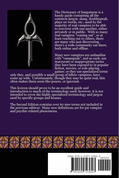 An indispensable guide containing all the common jargon, slang, doublespeak, plays on words, etc., used by real vampires to converse with one another, either privately or in public. With so many real vampires "coming out", or at least reaching out to others, there are many who just discovering there's a wide community out there, both on and offline. Many new vampires are unfamiliar with "vampspeak", and as such, use inaccurate or inappropriate terms they have been exposed to in popular fiction, movie, or role-playing games; or they use specialized terms only they, and possibly a small group of fellow vampires, have come up with. Unfortunately, though they may be quite real, this often makes them seem like posers, or ignorant. This lexicon should be an excellent guide and introduction to much of the terminology used; it is not intended to cover the highly specialized terminology and jargon used by specific groups and houses. This edition includes over 60 new terms not contained in the previous.