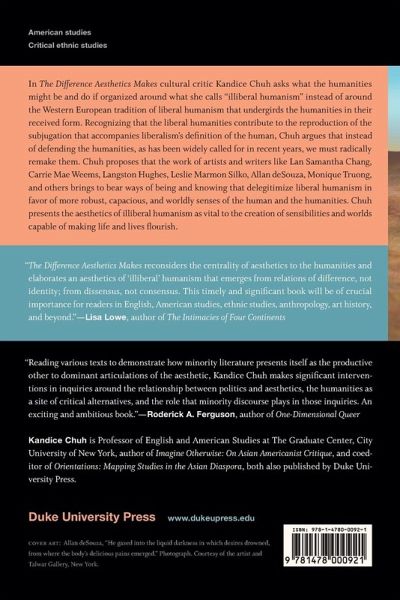 In The Difference Aesthetics Makes cultural critic Kandice Chuh asks what the humanities might be and do if organized around what she calls "illiberal humanism" instead of around the Western European tradition of liberal humanism that undergirds the humanities in their received form. Recognizing that the liberal humanities contribute to the reproduction of the subjugation that accompanies liberalism's definition of the human, Chuh argues that instead of defending the humanities, as has been widely called for in recent years, we should radically remake them. Chuh proposes that the work of artists and writers like Lan Samantha Chang, Carrie Mae Weems, Langston Hughes, Leslie Marmon Silko, Allan deSouza, Monique Truong, and others brings to bear ways of being and knowing that delegitimize liberal humanism in favor of more robust, capacious, and worldly senses of the human and the humanities. Chuh presents the aesthetics of illiberal humanism as vital to the creation of sensibilities and worlds capable of making life and lives flourish.