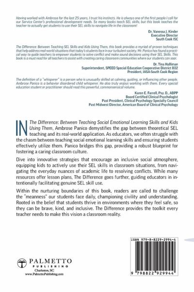 In The Difference: Between Teaching Social Emotional Learning Skills and Kids Using Them, Ambrose Panico demystifies the gap between theoretical SEL teaching and its real-world application. As educators, we often struggle with the chasm between teaching social emotional learning skills and ensuring students effectively utilize them. Panico bridges this gap, providing a robust blueprint for fostering a caring classroom culture. Dive into innovative strategies that encourage an inclusive social atmosphere, equipping kids to actively use their SEL skills in classroom situations, from navigating the everyday nuances of academic life to resolving conflicts. While many resources offer lesson plans, The Difference goes further, guiding educators in intentionally facilitating genuine SEL skill use. Within the nurturing boundaries of this book, readers are called to challenge the "meanness" our students face daily, championing civility and understanding. Rooted in the belief that students thrive in environments where they feel safe, so they can be brave, kind, and inclusive. The Difference provides the toolkit every teacher needs to make this vision a classroom reality.