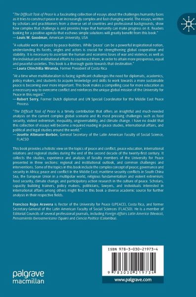 Chapter 1. Introduction. Francisco Rojas Aravena.- Chapter 2. The Complex Concept of Peace in an Uncertain World. Fernando Blasco.- Chapter 3. Peace, Governance and Security in Africa: Getting it Right. Samuel Kale Ewusi and Kingsley L. Ngange.- Chapter 4. Prospects of Peace and Conflict in the Middle East in the 21st Century. Amr Abdalla, Lilya Akay, and Zeynya Shikur.- Chapter 5. Latin America and the International Court of Justice. Juan Carlos Sainz-Borgo.- Chapter 6. Securitizing South China Sea: ASEANs Response to Traditional and Non-Traditional Maritime Security Conflicts. Alma María O. Salvador and Daisy C. Salvador.- Chapter 7. Role of International Adjudication in Conflict Resolution and Transformation. Mihir Kanade.- Chapter 8. The European Union: A Sound Superpower in a Multipolar World. Enrique Barón Crespo and Pelayo Castro.- Chapter 9. The Belt and Road: Building a Community of Shared Interests Together. Zhang Xiaoyu.- Chapter10. The African Union in the Present Context. Ekwealor Chinedu Thomas.- Chapter 11. Religious Fundamentalism and Violent Extremism. Zahid Shahab Ahmed.- Chapter 12. Terrorist Fighters, Mass Surveillance, and International Law. Mariateresa Garrido.- Chapter 13. Achieving Food Security in the Face of Inequality, Climate Change and Conflict. Olivia Sylvester.- Chapter 14. Using Participatory Action Research to Define Cultures of Peace. Heather Kertyzia