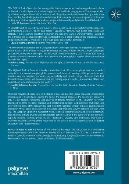 Chapter 1. Introduction. Francisco Rojas Aravena.- Chapter 2. The Complex Concept of Peace in an Uncertain World. Fernando Blasco.- Chapter 3. Peace, Governance and Security in Africa: Getting it Right. Samuel Kale Ewusi and Kingsley L. Ngange.- Chapter 4. Prospects of Peace and Conflict in the Middle East in the 21st Century. Amr Abdalla, Lilya Akay, and Zeynya Shikur.- Chapter 5. Latin America and the International Court of Justice. Juan Carlos Sainz-Borgo.- Chapter 6. Securitizing South China Sea: ASEANs Response to Traditional and Non-Traditional Maritime Security Conflicts. Alma María O. Salvador and Daisy C. Salvador.- Chapter 7. Role of International Adjudication in Conflict Resolution and Transformation. Mihir Kanade.- Chapter 8. The European Union: A Sound Superpower in a Multipolar World. Enrique Barón Crespo and Pelayo Castro.- Chapter 9. The Belt and Road: Building a Community of Shared Interests Together. Zhang Xiaoyu.- Chapter10. The African Union in the Present Context. Ekwealor Chinedu Thomas.- Chapter 11. Religious Fundamentalism and Violent Extremism. Zahid Shahab Ahmed.- Chapter 12. Terrorist Fighters, Mass Surveillance, and International Law. Mariateresa Garrido.- Chapter 13. Achieving Food Security in the Face of Inequality, Climate Change and Conflict. Olivia Sylvester.- Chapter 14. Using Participatory Action Research to Define Cultures of Peace. Heather Kertyzia