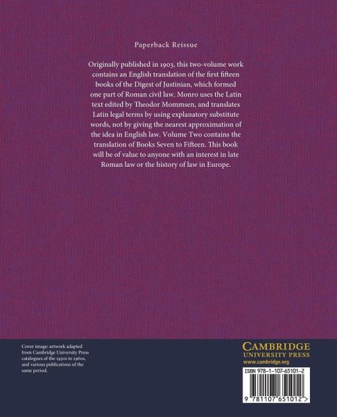 Originally published in 1903, this two-volume work contains an English translation of the first fifteen books of the Digest of Justinian, which formed one part of Roman civil law. Monro uses the Latin text edited by Theodor Mommsen, and translates Latin legal terms by using explanatory substitute words, not by giving the nearest approximation of the idea in English law. Volume Two contains the translation of Books Seven to Fifteen. This book will be of value to anyone with an interest in late Roman law or the history of law in Europe.