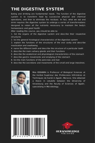 Eating and drinking are fundamental needs. The function of the digestive system is to transform food by successive physical and chemical operations, and then to eliminate the residues. In fact, what we eat and drink requires the digestive system to undergo a series of transformations designed to retain all the nutrients necessary to maintain the body's homeostasis and good health.After reading this course, you should be able to:1. list the organs of the digestive system and describe their respective structures2. list the general histological characteristics of the digestive system3. explain the functions of the structures of the oral cavity and describe mastication and swallowing4. name the different teeth and describe the structure of a particular tooth5. describe the main salivary glands and their functions6. describe the anatomical and physiological characteristics of the stomach7. describe gastric movements and emptying of the stomach8. list the main functions of the pancreasand liver9. describe the secretions and movements of the small and large intestines.