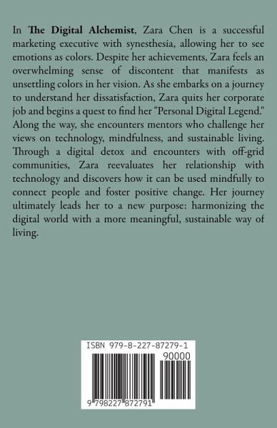 In The Digital Alchemist, Zara Chen is a successful marketing executive with synesthesia, allowing her to see emotions as colors. Despite her achievements, Zara feels an overwhelming sense of discontent that manifests as unsettling colors in her vision. As she embarks on a journey to understand her dissatisfaction, Zara quits her corporate job and begins a quest to find her "Personal Digital Legend." Along the way, she encounters mentors who challenge her views on technology, mindfulness, and sustainable living. Through a digital detox and encounters with off-grid communities, Zara reevaluates her relationship with technology and discovers how it can be used mindfully to connect people and foster positive change. Her journey ultimately leads her to a new purpose: harmonizing the digital world with a more meaningful, sustainable way of living.