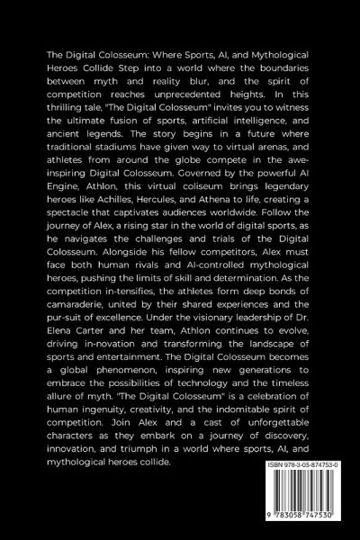 The Digital Colosseum: Where Sports, AI, and Mythological Heroes Collide Step into a world where the boundaries between myth and reality blur, and the spirit of competition reaches unprecedented heights. In this thrilling tale, "The Digital Colosseum" invites you to witness the ultimate fusion of sports, artificial intelligence, and ancient legends. The story begins in a future where traditional stadiums have given way to virtual arenas, and athletes from around the globe compete in the awe-inspiring Digital Colosseum. Governed by the powerful AI Engine, Athlon, this virtual coliseum brings legendary heroes like Achilles, Hercules, and Athena to life, creating a spectacle that captivates audiences worldwide. Follow the journey of Alex, a rising star in the world of digital sports, as he navigates the challenges and trials of the Digital Colosseum. Alongside his fellow competitors, Alex must face both human rivals and AI-controlled mythological heroes, pushing the limits of skill and determination. As the competition intensifies, the athletes form deep bonds of camaraderie, united by their shared experiences and the pursuit of excellence. Under the visionary leadership of Dr. Elena Carter and her team, Athlon continues to evolve, driving innovation and transforming the landscape of sports and entertainment. The Digital Colosseum becomes a global phenomenon, inspiring new generations to embrace the possibilities of technology and the timeless allure of myth. "The Digital Colosseum" is a celebration of human ingenuity, creativity, and the indomitable spirit of competition. Join Alex and a cast of unforgettable characters as they embark on a journey of discovery, innovation, and triumph in a world where sports, AI, and mythological heroes collide.