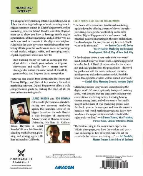 Leland Harden and Bob Heyman, online marketing pioneers and authors of the popular book Net Results, share their top tips to help marketers compete in this comprehensive digital marketing guide. In the current market, organizations face the very real challenge and necessity of engaging and appealing to their customers online. Digital Engagement teaches them how to do just that by introducing the best venues for online marketing and the latest and greatest digital marketing tools, including search engine optimization, affiliate marketing, social networking, virtual worlds, widgets, wikis, and emerging media. Marketers will learn how to: stop burning money on web advertising campaigns that don't deliver; tweak websites to improve conversions and traffic flow; master proven strategies for consumer-generated media; and generate buzz and improve brand recognition. Featuring case studies from companies like Toyota and Tommy Hilfiger as well as up-to-the-minute lists of key vendors for online marketing software, this is the only start-to-finish guide for navigating the newest and most effective online marketing tools.