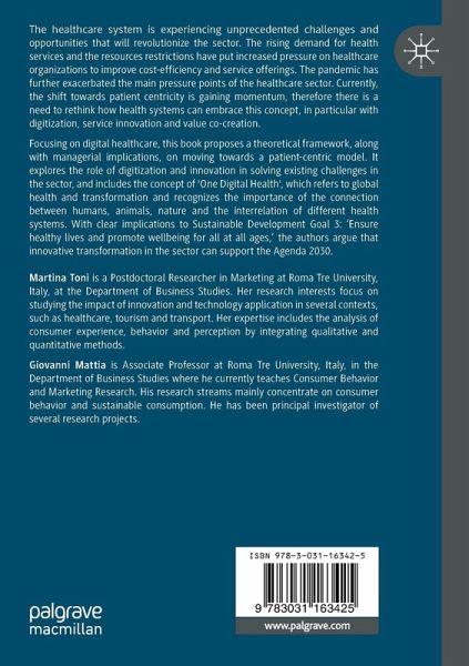 Focusing on digital healthcare, this book proposes a theoretical framework, along with managerial implications, on moving towards a patient-centric model. It explores the role of digitization and innovation in solving existing challenges in the sector, and includes the concept of 'One Digital Health', which refers to global health and transformation and recognizesthe importanceof the connection between humans, animals, nature and the interrelation of different health systems. With clear implications to Sustainable Development Goal 3: 'Ensure healthy lives and promote wellbeing for all at all ages,' the authors argue that innovative transformation in the sector can support the Agenda 2030.