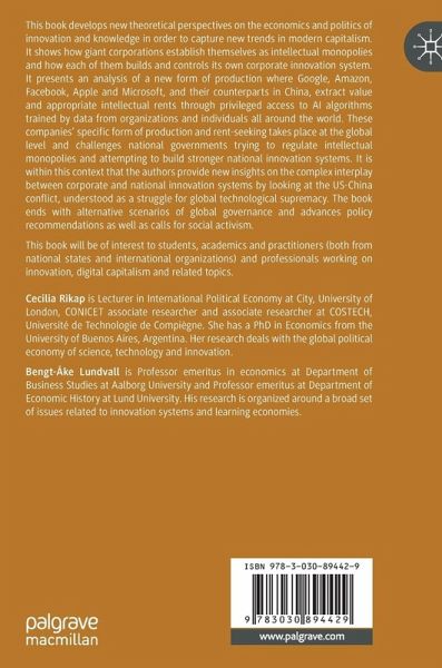 This book develops new theoretical perspectives on the economics and politics of innovation and knowledge in order to capture new trends in modern capitalism. It shows how giant corporations establish themselves as intellectual monopolies and how each of them builds and controls its own corporate innovation system. It presents an analysis of a new form of production where Google, Amazon, Facebook, Apple and Microsoft, and their counterparts in China, extract value and appropriate intellectual rents through privileged access to AI algorithms trained by data from organizations and individuals all around the world.