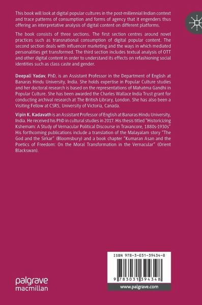 The book consists of three sections. The first section centres around novel practices such as transnational consumption of digital popular content. The second section deals with influencer marketing and the ways in which mediated personalities get transformed. The third section includes textual analysis of OTT and other digital content in order to understand its effects on refashioning social identities such as class caste and gender.