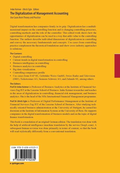 Digital transformation has companies firmly in its grip. Digitalization has a multidimensional impact on the mangagement accounting function and is changing mangagement accounting processes, controlling methods and the role of the mangagement accountant. This edited work shows how the opportunities of digitalization can be used in a way that adds value to the mangagement accounting function. The authors describe individual dimensions of digitalization in mangagement accounting and convey the necessary fundamentals and concepts. Use cases from controlling practice complement the theoretical foundations and show cross-industry approaches to solutions.