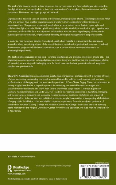 The goal of this book is to gain a clear picture of the current status and future challenges with regard to the digitalization of the supply chain - from the perspective of the suppliers, the manufacturers, and the customers. They were the target groups of the book. Digitization has touched upon all aspects of businesses, including supply chains. Technologies such as RFID, GPS, and sensors have enabled organizations to transform their existing hybrid (combination of paper-based and IT-supported processes) supply chain structures into more f lexible, open, agile, and collaborative digital models. Unlike hybrid supply chain models, which have resulted in rigid organizational structures, unobtainable data, and disjointed relationships with partners, digital supply chains enable business process automation, organizational flexibility, and digital management of corporate assets. In order to reap maximum benefits from digital supply chain models, it is important that companies internalize it as an integral part of the overall business model and organizational structure. Localized disconnected projects and silo-based operations pose a serious threat to competitiveness in an increasingly digital world. The technologies discussed in this text - artificial intelligence, 3D printing, Internet of things, etc. - are beginning to come together to help digitize, automate, integrate, and improve the global supply chains. It's certainly an exciting and challenging time for both new supply chain professionals and long-time supply chain professionals.