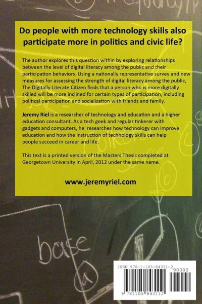 Do people with more technology skills also participate more in political and civic life? The author explores this question within by exploring relationships between the level of digital literacy among the public and their participation behaviors. Using a nationally representative survey and new measures for assessing the strength of digital literacy among the public, author finds that a person who is more digitally skilled will be more inclined for certain types of participation, including political participation and socialization with friends and family. Jeremy Riel is a researcher of technology and education and a higher education consultant. As a tech geek and regular tinkerer with gadgets and computers, he researches how technology can improve education and how the instruction of technology skills can help people succeed in career and life. This text is a printed version of the Masters Thesis completed at Georgetown University in April, 2012 under the same name. www.jeremyriel.com