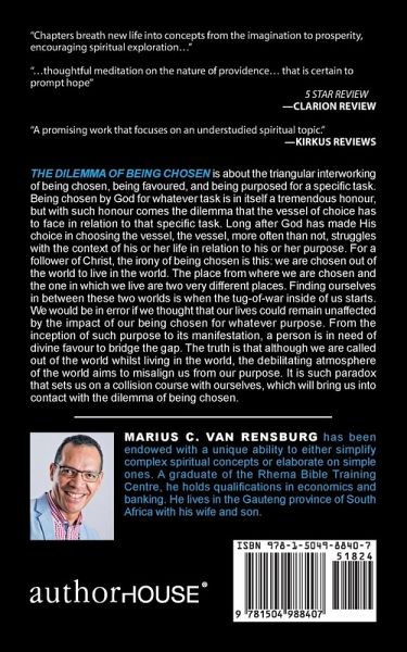 THE DILEMMA OF BEING CHOSEN is about the triangular interworking of being chosen, being favoured, and being purposed for a specific task. Being chosen by God for whatever task is in itself a tremendous honour, but with such honour comes the dilemma that the vessel of choice has to face in relation to that specific task. Long after God has made His choice in choosing the vessel, the vessel, more often than not, struggles with the context of his or her life in relation to his or her purpose. For a follower of Christ, the irony of being chosen is this: we are chosen out of the world to live in the world. The place from where we are chosen and the one in which we live are two very different places. Finding ourselves in between these two worlds is when the tug-of-war inside of us starts. We would be in error if we thought that our lives could remain unaffected by the impact of our being chosen for whatever purpose. From the inception of such purpose to its manifestation, a person is in need of divine favour to bridge the gap. The truth is that although we are called out of the world whilst living in the world, the debilitating atmosphere of the world aims to misalign us from our purpose. It is such paradox that sets us on a collision course with ourselves, which will bring us into contact with the dilemma of being chosen.