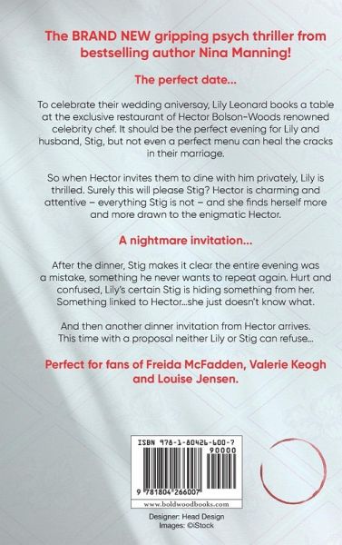 Don't miss the BRAND NEW gripping psych thriller from bestselling author Nina Manning! Perfect for fans of Frieda McFadden! The perfect date... To celebrate their wedding aniversay, Lily Leonard books a table at the exclusive restaurant of Hector Bolson-Woods renowned celebrity chef. It should be the perfect evening for Lily and husband, Stig, but not even a perfect menu can heal the cracks in their marriage. So when Hector invites them to dine with him privately, Lily is thrilled. Surely this will please Stig? Hector is charming and attentive - everything Stig is not - and she finds herself more and more drawn to the enigmatic Hector. A nightmare invitation... After the dinner, Stig makes it clear the entire evening was a mistake, something he never wants to repeat again. Hurt and confused, Lily's certain Stig is hiding something from her. Something linked to Hector...she just doesn't know what. And then another dinner invitation from Hector arrives. This time with a proposal neither Lily or Stig can refuse... Perfect for fans of Freida McFadden, Valerie Keogh and Louise Jensen. Praise for Nina Manning 'Addictive... and beautifully written...I loved it.' Number One Bestselling author Valerie Keogh. 'Heart-stopping, pacy and tension filled. Highly recommended.' Claire Allan , USA Today Bestseller 'Compelling and claustrophobic, Nina is an exciting new voice and definitely one to watch' Phoebe Morgan 'An addictive and compelling summer read. Manning keeps you hooked throughout and guessing until the end. The perfect book to take on holiday.' Natasha Boydell 'Chilling and creepy. An atmospheric and addictive debut.' Diane Jeffrey 'Totally addictive. I couldn't put it down!' Darren O'Sullivan 'A claustrophobic, nail-biting thriller that draws you in and doesn't let go.' Naomi Joy 'Clever, emotionally draining and totally gripping. I absolutely loved this book!' D E White