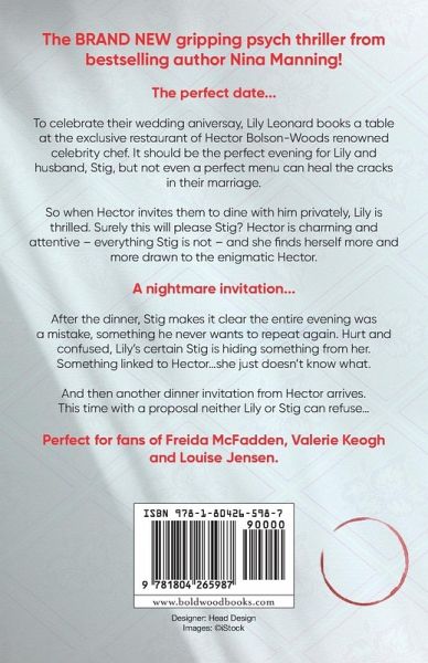 Don't miss the BRAND NEW gripping psych thriller from bestselling author Nina Manning! Perfect for fans of Frieda McFadden! The perfect date... To celebrate their wedding aniversay, Lily Leonard books a table at the exclusive restaurant of Hector Bolson-Woods renowned celebrity chef. It should be the perfect evening for Lily and husband, Stig, but not even a perfect menu can heal the cracks in their marriage. So when Hector invites them to dine with him privately, Lily is thrilled. Surely this will please Stig? Hector is charming and attentive - everything Stig is not - and she finds herself more and more drawn to the enigmatic Hector. A nightmare invitation... After the dinner, Stig makes it clear the entire evening was a mistake, something he never wants to repeat again. Hurt and confused, Lily's certain Stig is hiding something from her. Something linked to Hector...she just doesn't know what. And then another dinner invitation from Hector arrives. This time with a proposal neither Lily or Stig can refuse... Perfect for fans of Freida McFadden, Valerie Keogh and Louise Jensen. Praise for Nina Manning 'Addictive... and beautifully written...I loved it.' Number One Bestselling author Valerie Keogh. 'Heart-stopping, pacy and tension filled. Highly recommended.' Claire Allan , USA Today Bestseller 'Compelling and claustrophobic, Nina is an exciting new voice and definitely one to watch' Phoebe Morgan 'An addictive and compelling summer read. Manning keeps you hooked throughout and guessing until the end. The perfect book to take on holiday.' Natasha Boydell 'Chilling and creepy. An atmospheric and addictive debut.' Diane Jeffrey 'Totally addictive. I couldn't put it down!' Darren O'Sullivan 'A claustrophobic, nail-biting thriller that draws you in and doesn't let go.' Naomi Joy 'Clever, emotionally draining and totally gripping. I absolutely loved this book!' D E White