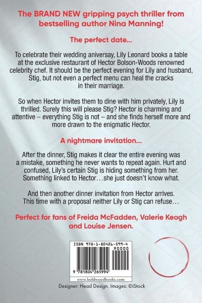 Don't miss the BRAND NEW gripping psych thriller from bestselling author Nina Manning! Perfect for fans of Frieda McFadden! The perfect date... To celebrate their wedding aniversay, Lily Leonard books a table at the exclusive restaurant of Hector Bolson-Woods renowned celebrity chef. It should be the perfect evening for Lily and husband, Stig, but not even a perfect menu can heal the cracks in their marriage. So when Hector invites them to dine with him privately, Lily is thrilled. Surely this will please Stig? Hector is charming and attentive - everything Stig is not - and she finds herself more and more drawn to the enigmatic Hector. A nightmare invitation... After the dinner, Stig makes it clear the entire evening was a mistake, something he never wants to repeat again. Hurt and confused, Lily's certain Stig is hiding something from her. Something linked to Hector...she just doesn't know what. And then another dinner invitation from Hector arrives. This time with a proposal neither Lily or Stig can refuse... Perfect for fans of Freida McFadden, Valerie Keogh and Louise Jensen. Praise for Nina Manning 'Addictive... and beautifully written...I loved it.' Number One Bestselling author Valerie Keogh. 'Heart-stopping, pacy and tension filled. Highly recommended.' Claire Allan , USA Today Bestseller 'Compelling and claustrophobic, Nina is an exciting new voice and definitely one to watch' Phoebe Morgan 'An addictive and compelling summer read. Manning keeps you hooked throughout and guessing until the end. The perfect book to take on holiday.' Natasha Boydell 'Chilling and creepy. An atmospheric and addictive debut.' Diane Jeffrey 'Totally addictive. I couldn't put it down!' Darren O'Sullivan 'A claustrophobic, nail-biting thriller that draws you in and doesn't let go.' Naomi Joy 'Clever, emotionally draining and totally gripping. I absolutely loved this book!' D E White