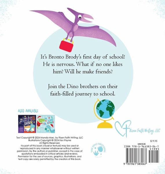 Is your child starting school? It's Bronto Brody's first day of school! He is nervous. What if no one likes him? Will he make friends? Join the Dino brothers on their faith-filled journey to school.