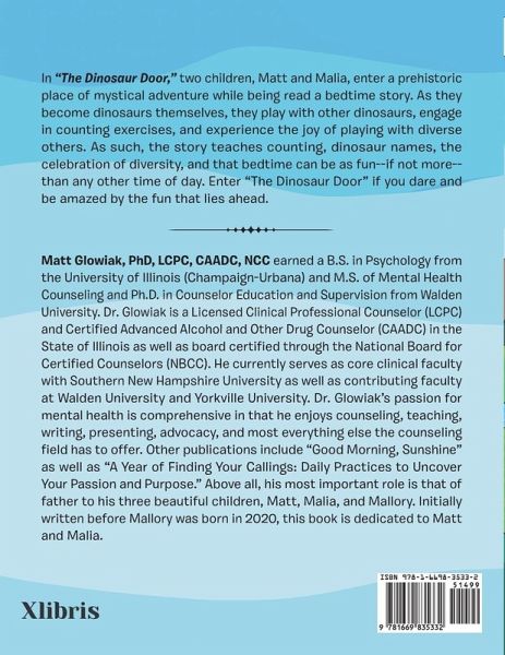 In "The Dinosaur Door," two children, Matt and Malia, enter a prehistoric place of mystical adventure while being read a bedtime story. As they become dinosaurs themselves, they play with other dinosaurs, engage in counting exercises, and experience the joy of playing with diverse others. As such, the story teaches counting, dinosaur names, the celebration of diversity, and that bedtime can be as fun--if not more--than any other time of day. Enter "The Dinosaur Door" if you dare and be amazed by the fun that lies ahead.
