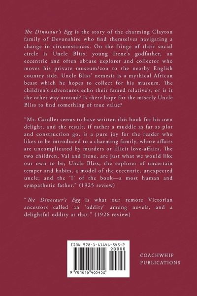 The Dinosaur's Egg is the story of the charming Clayton family of Devonshire who find themselves navigating a change in circumstances. On the fringe of their social circle is Uncle Bliss, young Irene's godfather, an eccentric and often obtuse explorer and collector who moves his private museum/zoo to the nearby English country side. Uncle Bliss' nemesis is a mythical African beast which he hopes to collect for his museum. The children's adventures echo their famed relative's, or is it the other way around? Is there hope for the miserly Uncle Bliss to find something of true value? 1926 review: "Light as a thistledown and with almost the rhythm of a babbling brook rushing over the stones, the author of The Dinosaur's Egg, entertains the reader in a manner almost unique. It is all delightfully amusing. It is a tale of the adventures, verbal and otherwise, of Uncle Bliss, intrepid African explorer and Nemesis of the rare pterodactyl found only in the morasses of the Jiundu river. It is also the humorous account of Uncle Bliss' contacts with a most charming Devonshire family. Uncle Bliss . . . collects for his museum, from the stuffed hippopotamus to the dinosaur's egg, and is often in consequence an embarrassment to country society and even to the government. . . . [Y]ou will find her a book that is highly entertaining and well worth reading." 1926 review: "The Dinosaur's Egg is what our remote Victorian ancestors called an 'oddity' among novels, and a delightful oddity at that. The narrator is an invalidated English officer from the Sudan, and has more humor than that class is usually given credit for. There is a bit of black magic in the tale, but even the savage relic from Africa with sinister and occult powers does its stuff in not too horrifying vein. The owner of the dinosaur's egg is an eccentric uncle, millionaire, collector and miser who establishes his private zoo in a peaceful English country side, says and does the unexpected thing on all occasions, and sets the key for a novel that is full of gentle wit and drollery verging on the fantastic yet retaining an air of plausibility by a manner of telling which begs you to believe in it for the afternoon, anyway. (1926)