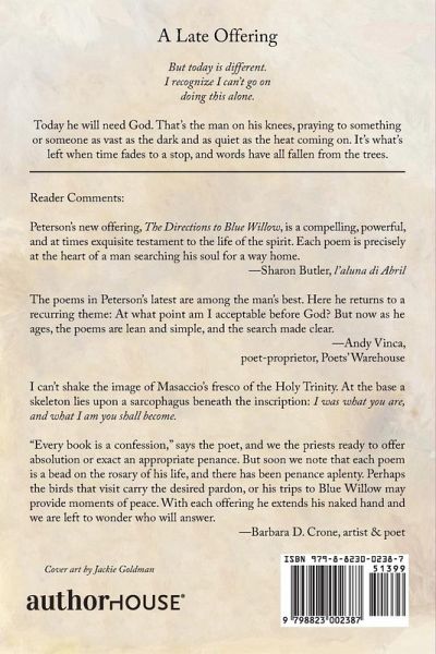 A Late Offering But today is different. I recognize I can't go on doing this alone. Today he will need God. That's the man on his knees, praying to something or someone as vast as the dark and as quiet as the heat coming on. It's what's left when time fades to a stop, and words have all fallen from the trees. ______________________________ Reader Comments: Peterson's new offering, The Directions to Blue Willow, is a compelling, powerful, and at times exquisite testament to the life of the spirit. Each poem is precisely at the heart of a man searching his soul for a way home. -Sharon Butler, l'aluna di Abril The poems in Peterson's latest are among the man's best. Here he returns to a recurring theme: At what point am I acceptable before God? But now as he ages, the poems are lean and simple, and the search made clear. -Andy Vinca, poet-proprietor, Poets' Warehouse I can't shake the image of Masaccio's fresco of the Holy Trinity. At the base a skeleton lies upon a sarcophagus beneath the inscription: I was what you are, and what I am you shall become. "Every book is a confession," says the poet, and we the priests ready to offer absolution or exact an appropriate penance. But soon we note that each poem is a bead on the rosary of his life, and there has been penance aplenty. Perhaps the birds that visit carry the desired pardon, or his trips to Blue Willow may provide moments of peace. With each offering he extends his naked hand and we are left to wonder who will answer. -Barbara D. Crone, artist & poet