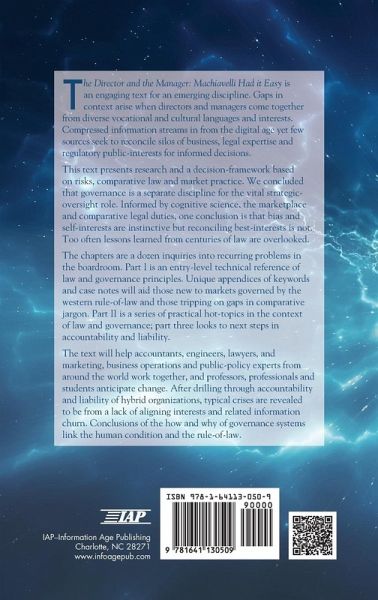Machiavelli Had it Easy is an engaging text for the emerging discipline of governance. Gaps arise when directors and managers come together from diverse vocational and cultural languages and interests. Compressed information streams in the digital age, yet few reconcile silos of business, legal expertise and regulatory public-interests for informed decisions. This text presents research and a market-tested decision-framework for comparative law, market practice, and human nature in the vital strategic-oversight role of governance. Informed by cognitive science, business practice and legal duties, one conclusion is that bias and self-interests are instinctive but reconciling best-interests is not. Too often lessons learned from centuries of law are overlooked. The chapters are a dozen inquiries into recurring problems in the boardroom. Part one is an entry-level technical reference of law and governance principles. Unique appendices of keywords and case notes will aid those new to markets governed by the western rule-of-law and those tripping on gaps in comparative jargon. Part two is a series of practical hot-topics in the context of law and governance; part three looks to next steps in accountability and liability. The text will help accountants, engineers, lawyers, and business operations and market-policy experts from around the world work together, and; professors, professionals and students anticipate change. After drilling through accountability and liability for hybrid organizations, typical crises are revealed to be from a lack of aligning interests and related information churn. Conclusions of the how and why of governance systems link the human condition and the rule-of-law in the digital age.