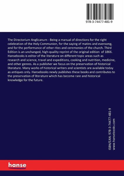 The Directorium Anglicanum - Being a manual of directions for the right celebration of the Holy Communion, for the saying of matins and evensong, and for the performance of other rites and ceremonies of the church. Third Edition is an unchanged, high-quality reprint of the original edition of 1866.Hansebooks is editor of the literature on different topic areas such as research and science, travel and expeditions, cooking and nutrition, medicine, and other genres. As a publisher we focus on the preservation of historical literature. Many works of historical writers and scientists are available today as antiques only. Hansebooks newly publishes these books and contributes to the preservation of literature which has become rare and historical knowledge for the future.