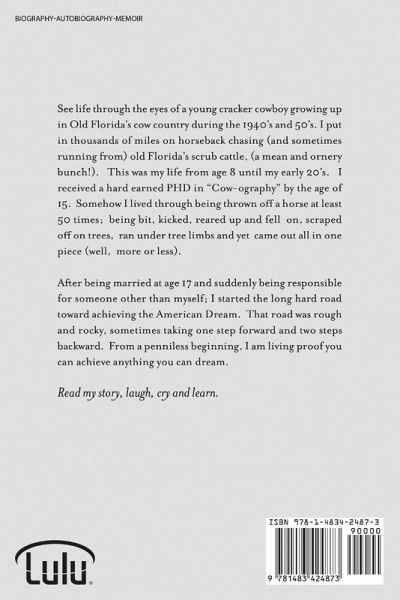 See life through the eyes of a young cracker cowboy growing up in Old Florida's cow country during the 1940's and 50's. I put in thousands of miles on horseback chasing (and sometimes running from) old Florida's scrub cattle, (a mean and ornery bunch!). This was my life from age 8 until my early 20's. I received a hard earned PHD in "Cow-ography" by the age of 15. Somehow I lived through being thrown off a horse at least 50 times; being bit, kicked, reared up and fell on, scraped off on trees, ran under tree limbs and yet came out all in one piece (well, more or less). After being married at age 17 and suddenly being responsible for someone other than myself; I started the long hard road toward achieving the American Dream. That road was rough and rocky, sometimes taking one step forward and two steps backward. From a penniless beginning, I am living proof you can achieve anything you can dream. Read my story, laugh, cry and learn.