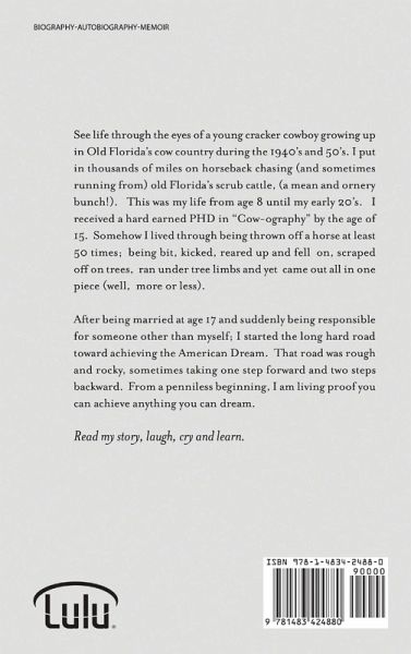 See life through the eyes of a young cracker cowboy growing up in Old Florida's cow country during the 1940's and 50's. I put in thousands of miles on horseback chasing (and sometimes running from) old Florida's scrub cattle, (a mean and ornery bunch!). This was my life from age 8 until my early 20's. I received a hard earned PHD in "Cow-ography" by the age of 15. Somehow I lived through being thrown off a horse at least 50 times; being bit, kicked, reared up and fell on, scraped off on trees, ran under tree limbs and yet came out all in one piece (well, more or less). After being married at age 17 and suddenly being responsible for someone other than myself; I started the long hard road toward achieving the American Dream. That road was rough and rocky, sometimes taking one step forward and two steps backward. From a penniless beginning, I am living proof you can achieve anything you can dream. Read my story, laugh, cry and learn.