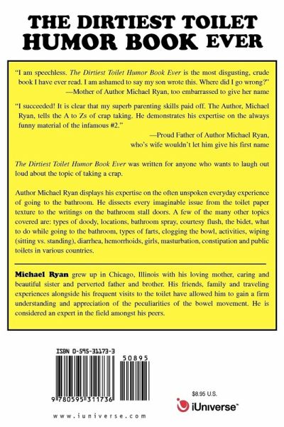 "I am speechless. The Dirtiest Toilet Humor Book Ever is the most disgusting, crude book I have ever read. I am ashamed to say my son wrote this. Where did I go wrong?" --Mother of Author Michael Ryan, too embarrassed to give her name "I succeeded! It is clear that my superb parenting skills paid off. The Author, Michael Ryan, tells the A to Zs of shit taking. He demonstrates his expertise on the always funny material of the infamous #2." --Proud Father of Author Michael Ryan, who's wife wouldn't let him give his first name The Dirtiest Toilet Humor Book Ever was written for anyone who wants to laugh out loud about the topic of taking a crap. Author Michael Ryan displays his expertise on the often unspoken everyday experience of going to the bathroom. He dissects every imaginable issue from the toilet paper texture to the writings on the bathroom stall doors. A few of the many other topics covered are: types of doody, locations, bathroom spray, courtesy flush, the bidet, what to do while going to the bathroom, types of farts, clogging the bowl, activities, wiping (sitting vs. standing), diarrhea, hemorrhoids, girls, masturbation, constipation and public toilets in various countries.